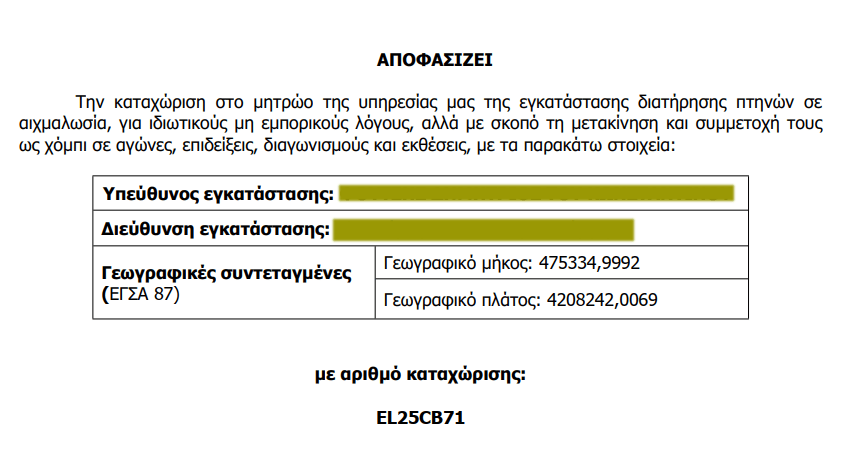 Aπο ΕΔΩ μπορείτε να κατεβάσετε την αίτηση που πρέπει να στείλετε στην κτηνιατρική υπηρεσία της περιφέρειάς σας, για την καταχώρηση της εγκατάστασής σας. Μαζί με αυτήν πρέπει να υποβληθεί σε ένα Α4… Μια περιγραφή των πουλιών που διατηρείτε αλλά και του χώρου, των κλωβών, των θερμαντικών ή ψυκτικών στοιχείων , του φωτισμού και όλων εκείνων που βοηθούν στην ευζωία των εκτρεφόμενων πουλιών.