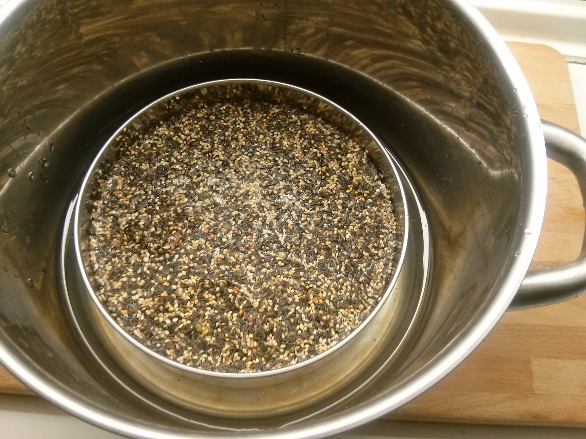Όσο μουλιάζουν οι σπόροι του δεύτερου κοσκινου στο νερό τοποθετούμε το πρώτο κόσκινο από πανω του
