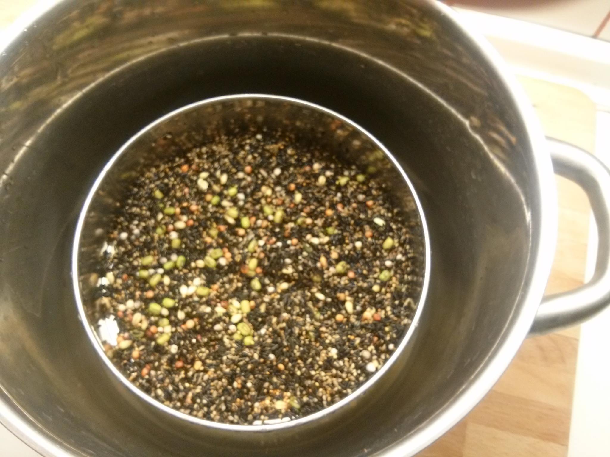 Τοποθετούμε το κόσκινο στην κατσαρόλα και προσθέτουμε νερό μέχρι να καλύψουμε τελείως τους σπόρους