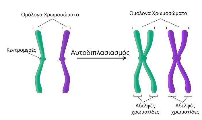 Πριν από κάθε κυτταρική διαίρεση, προκειμένου να διατηρηθεί και να μεταβιβαστεί η γενετική πληροφορία απο κύτταρο σε κύτταρο, το DNA αυτοδιπλασιάζεται μέσω μιας διαδικασίας που λέγεται αντιγραφή. Άμεση συνέπεια της αντιγραφής είναι και ο διπλασιασμός των χρωμοσωμάτων. Κάθε χρωμόσωμα πλέον είναι διπλό, υπάρχει σε δύο αντίγραφα του εαυτού του και περιγράφεται υπό τον όρο των αδελφών χρωματίδων. Οι αδελφές χρωματίδες είναι δύο πανομοιότυπα αντίγραφα που συγκρατούνται μεταξύ τους σε ένα σημείο, το κεντρομερίδιο.