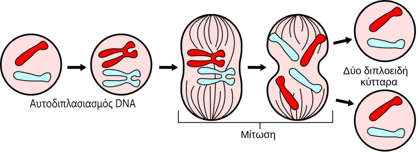 Η μίτωση είναι ο βασικός τρόπος αναπαραγωγής των κυττάρων και συμβαίνει αδιαλλείπτως σε ένα οργανισμό. Το αποτέλεσμα της μίτωσης είναι η δημιουργία δύο πανομοιότυπων κυττάρων με το αρχικό κύτταρο. Τα θυγατρικά κύτταρα έχουν διπλοειδή αριθμό χρωμοσωμάτων όπως και το γονικό.